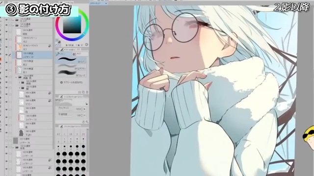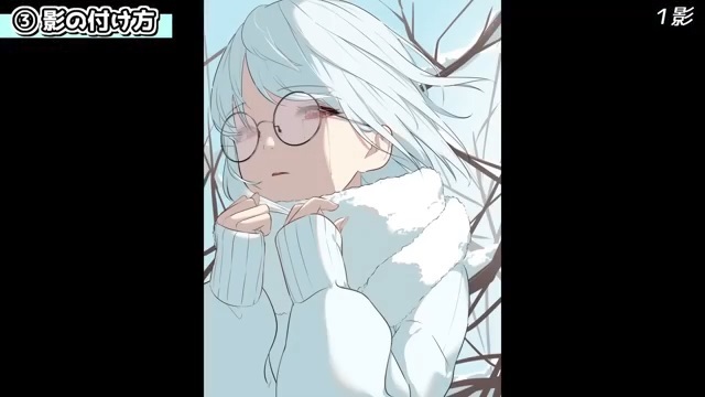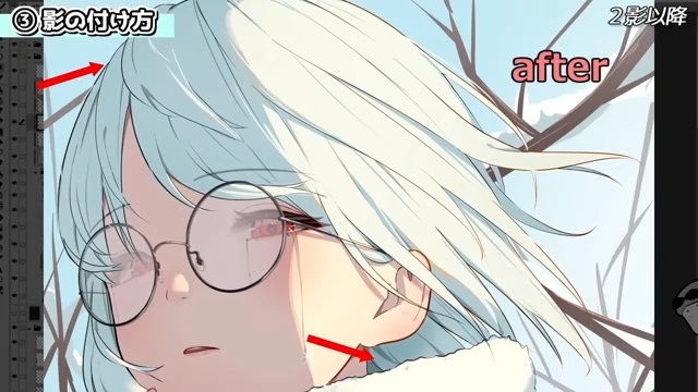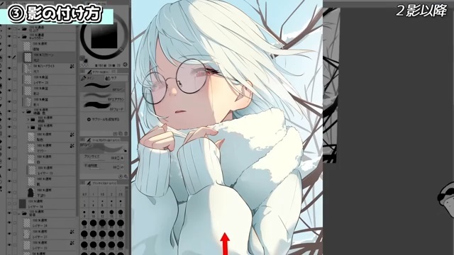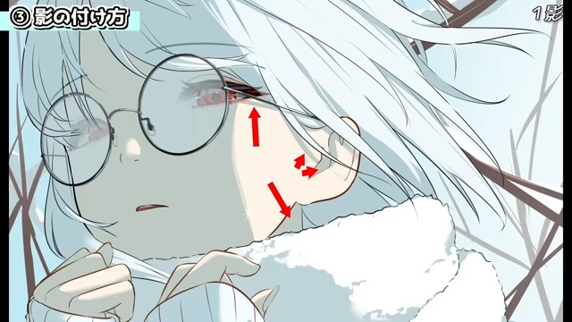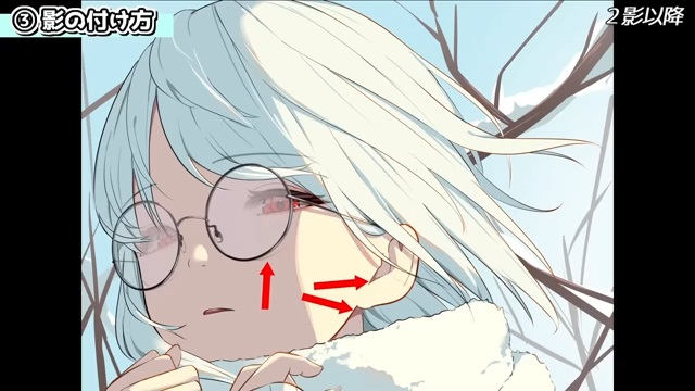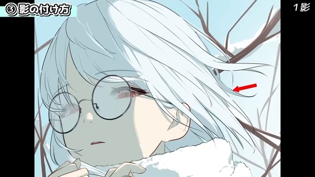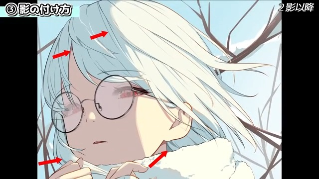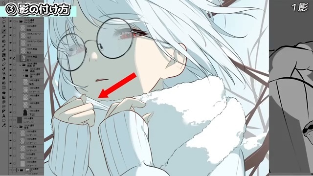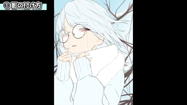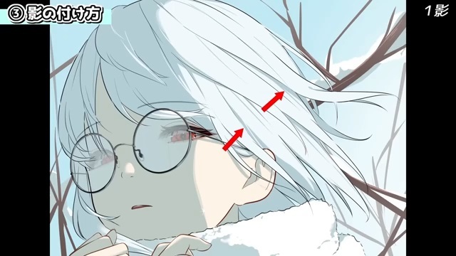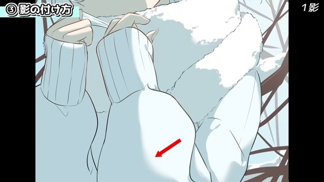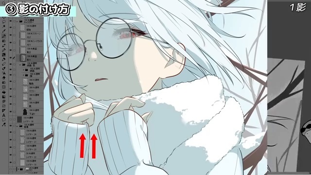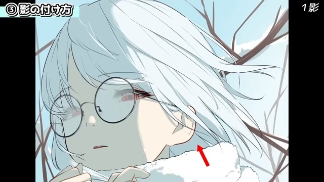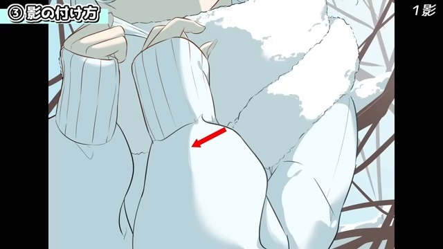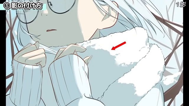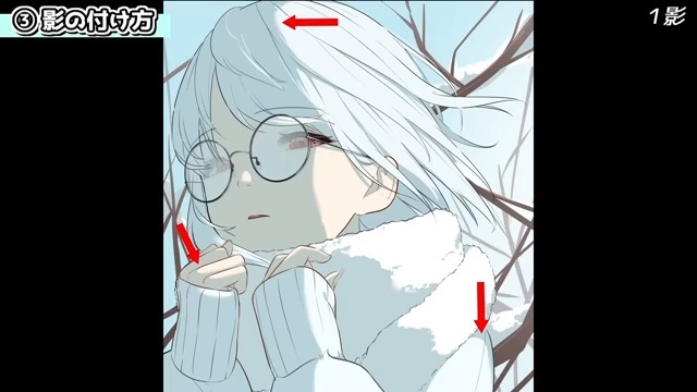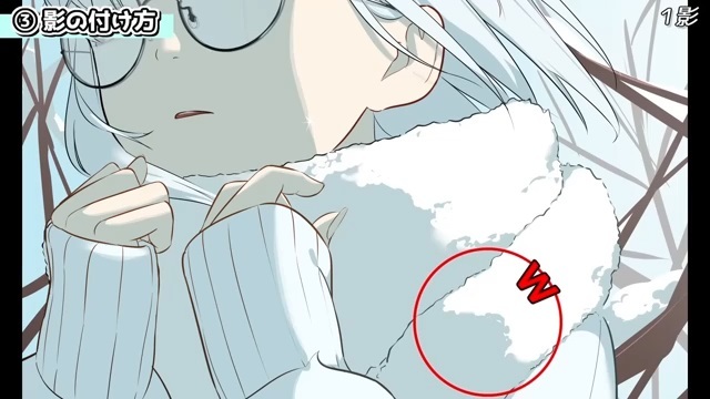 他にも、シルエットを分かりやすくするために光を入れていきます。例えば、服の袖とマフラーは同じ白色なので、遠近や輪郭を出すために光を入れます。