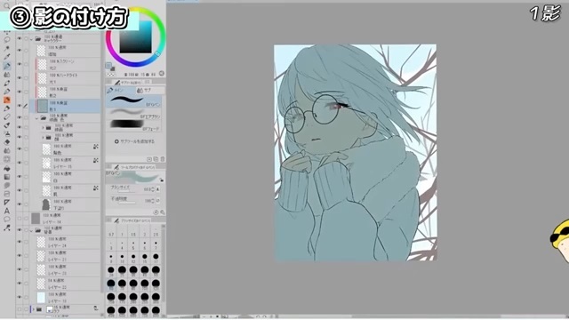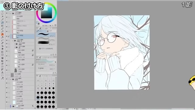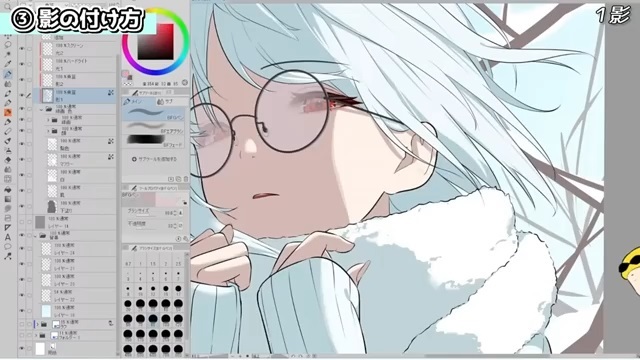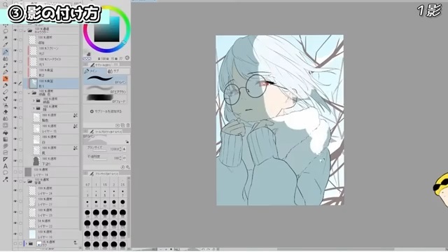 眼鏡と髪が顔に落とす影を入れ、耳の中、首にも影を入れています。このとき、髪の落ち影は遠くなるにつれてぼかしています。