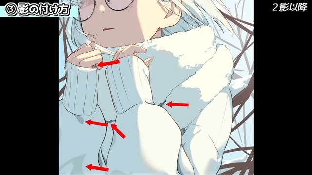 身体の2影は、手の暗い部分、マフラーの落ち影、服のシワなどです。