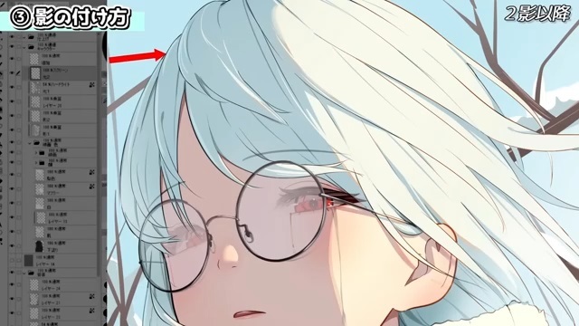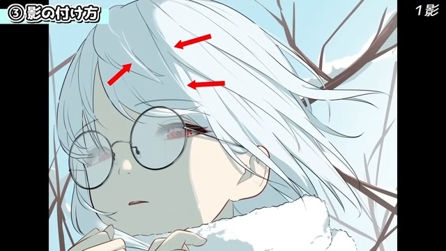 この影は、風に吹かれた髪が作る落ち影や、髪の流れを見せるための影です。