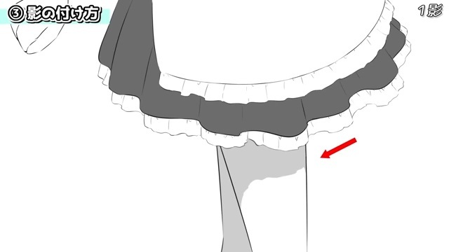 この方法はスカートなどを描く時にも落ち影でよく使います。太もものような丸みがあるものは、その立体感を表現するために円柱のパースを意識して影をつけてみましょう。
