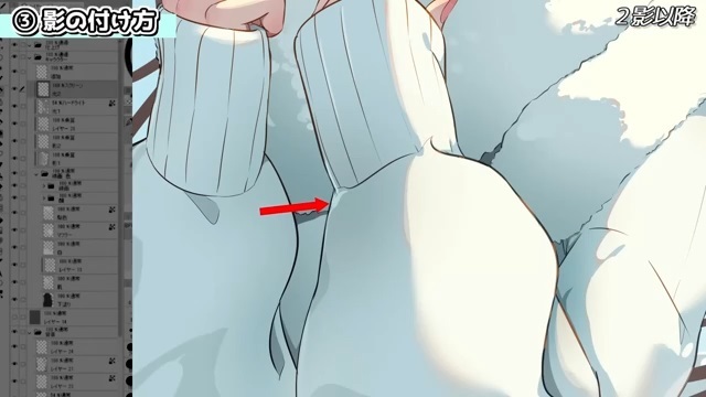 マフラーの下や服のシワが深いところ、1影の中でも特に奥の方の場所などに2影を入れていきます。